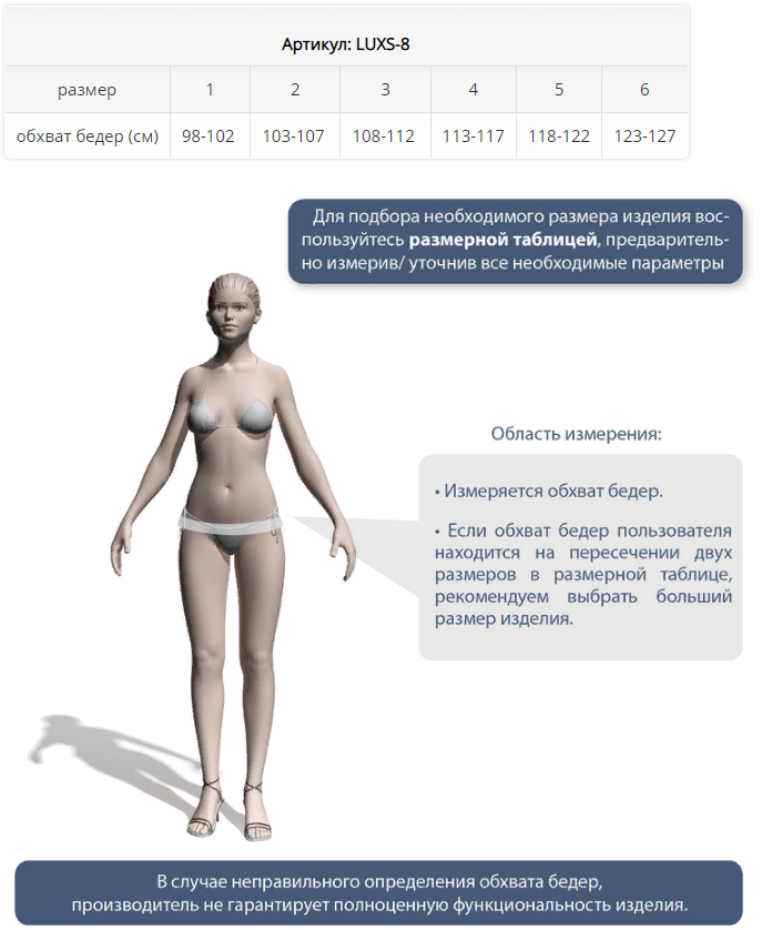 В случае неправильного определения обхвата бедер, производитель не гарантирует полноценную функциональность изделия.